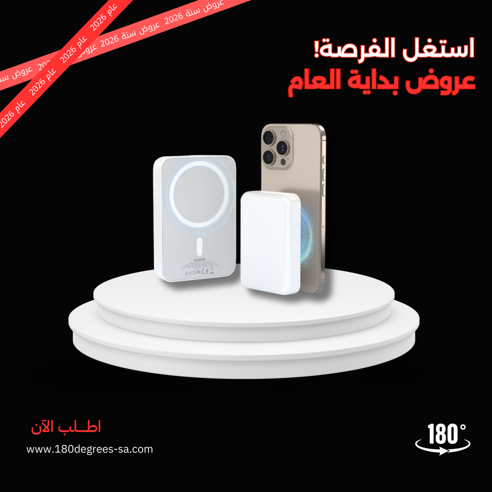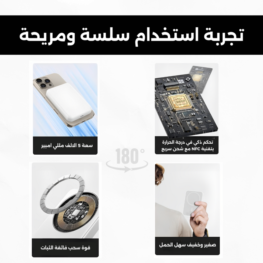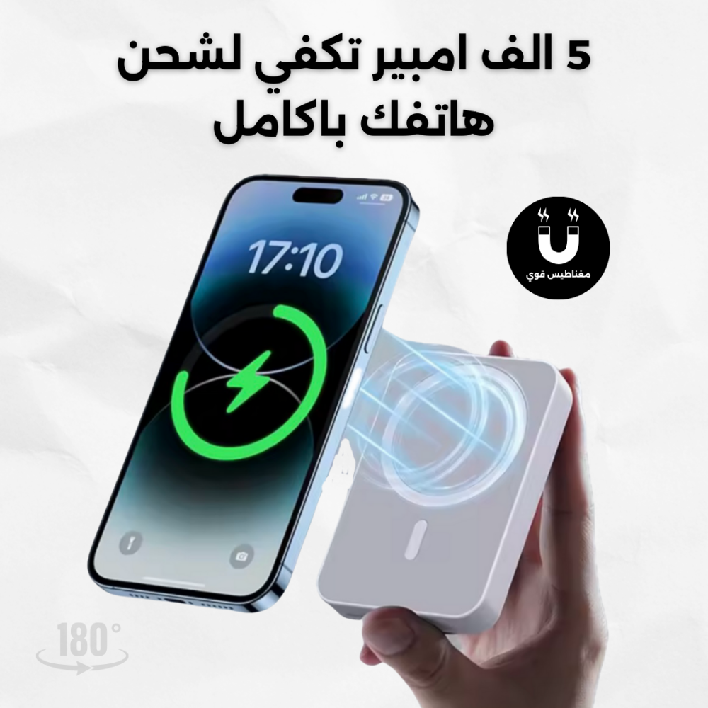 يثبت مغناطيسي على جوالك ويشحنك لاسلكيًا بدون كيابل مزعجة. حجمه صغير يدخل بالجيب وسعته تكفيك شحنة كاملة تقريبًا 👌